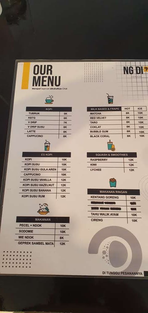Welcome to NG DI Cafe and Bar, a charming spot nestled in the heart of Lumajang, East Java. This lively café is perfect for coffee aficionados and casual chatters alike. As you step in, the cozy atmosphere invites you to unwind and savor delightful moments with friends.